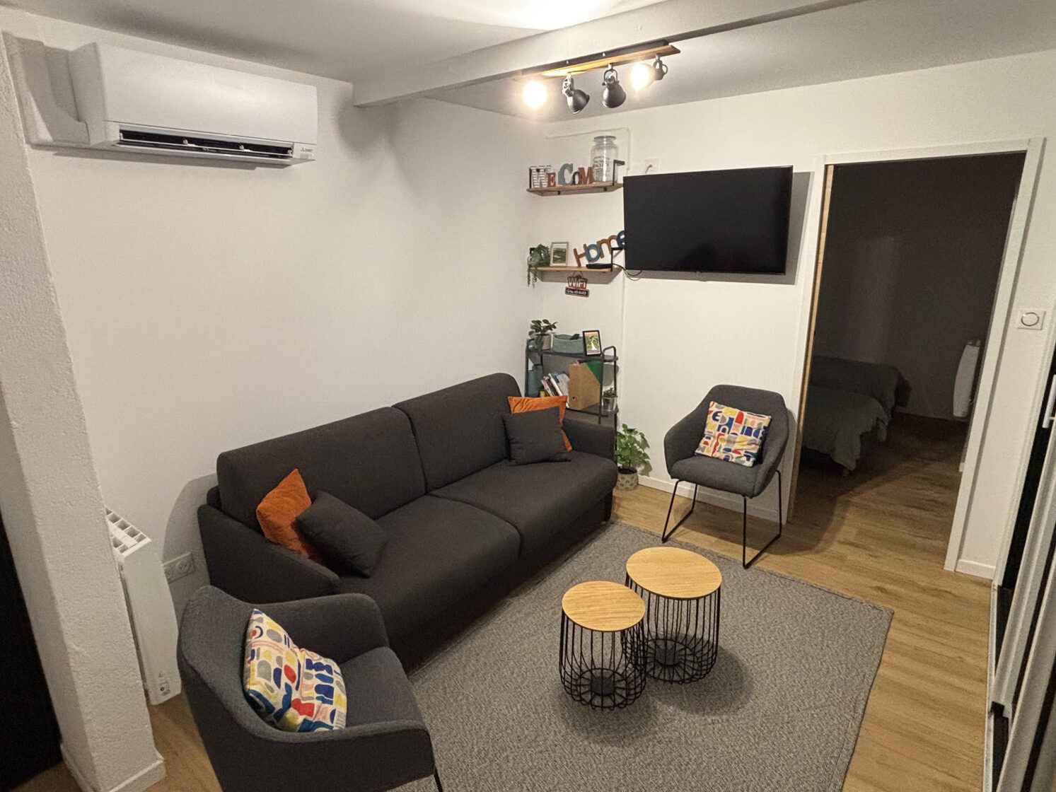 - Salon avec canapé convertible rapido de 160 x 190 cm, table basse, jeux